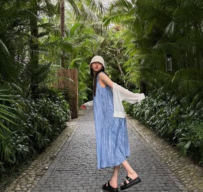 김지은은 이번에 시원한 블루 롱원피스로 여름 여행룩을 완성했습니다. 원피스 위에는 얇은 화이트 가디건을 걸쳐 가볍게 연출했으며, 모자는 귀여운 느낌을 주는 버킷햇을 착용해 스타일을 더욱 돋보이게 했습니다. 신발은 통굽 블랙 샌들로 편안하면서도 스타일리시한 분위기를 연출했죠.