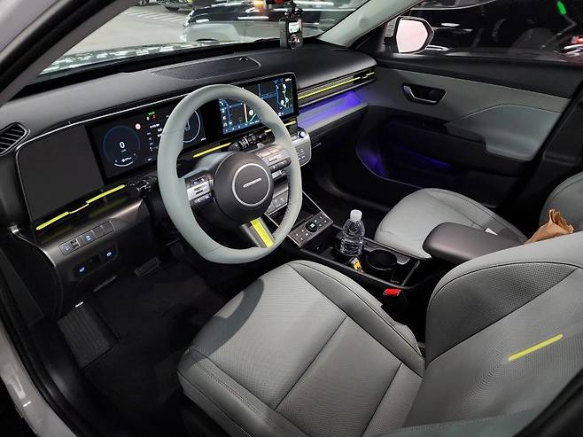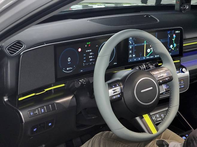 인테리어는 외형과 다르게 아주 정돈된 모습입니다. 디지털 클러스터와 내비 모니터도 이미 현대의 익숙한 모습이긴 하지만 유난히 디올뉴코나에서는 잘 어울리는 느낌이 강합니다. 아마 그랜저에 들어간 것과 동일한 사이즈일 것 같은데 실내 공간과의 비율 때문인지 전반적으로 만족스럽습니다.