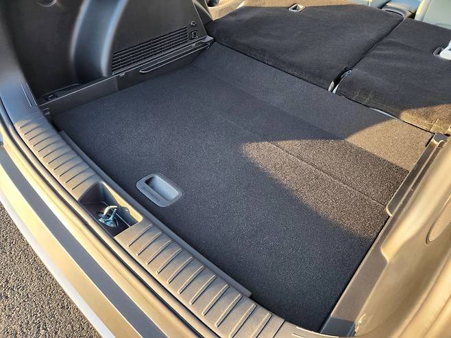 2열에 개선이 이루어진 것처럼 적재공간도 상당히 커졌습니다. 실측을 해보니 특히나 적재공간의 깊이(앞뒤)가 많이 커졌는데 10cm 넘게 커졌기 때문에 그동안 조금 크기가 아쉬워서 선택 못했던 분들이 계셨다면 이제는 충분히 해결되실 것 같습니다. 2열 시트는 플랫하게 접히고 단차도 거의 없다는 점이 좋습니다.