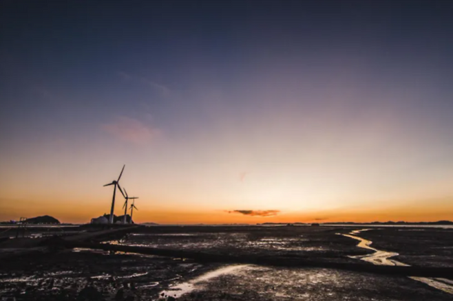 풍차 실루엣 사이로 떨어지는 붉은 노을