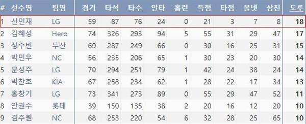 | ▲ 도루 부문 1위에 오른 신민재 |