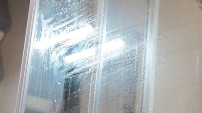 이것은 저희 집 샤워부스예요. 보시면 물때가 많고 유리가 투명하지 않을 정도로 정말 더러운데요. 묵은 물때가 쉽게 제거되지 않았답니다.