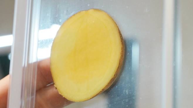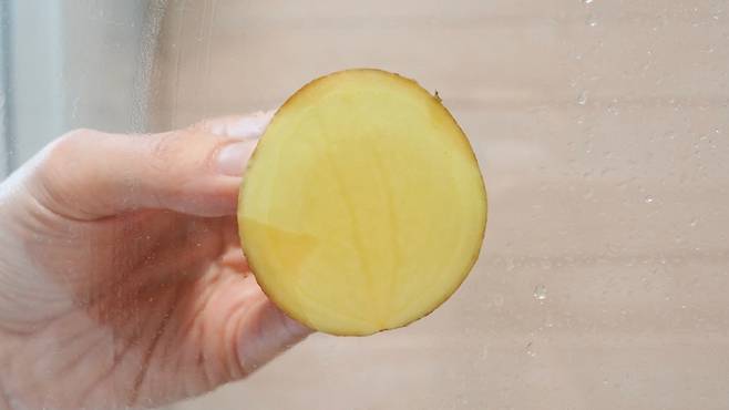 이제 유리를 감자로 문지를 차례인데요. 감자를 반으로 잘라 사진처럼 구석구석 문질러 주세요.