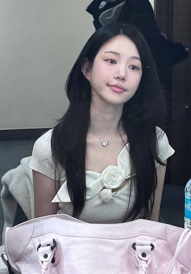 긴 생머리에 잔잔한 웨이브를 더해 청순한 이미지를 강조했으며, 블랙 초커와 진주 이어링으로 여성스러운 포인트를 살렸습니다.