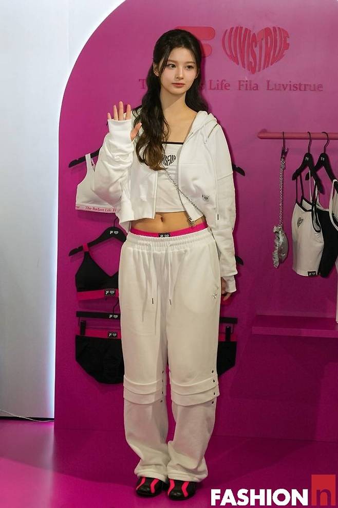 이날 설윤은 화이트 스웻 슈트와 핑크색 팬티 밴딩이 살짝 보이는 스타일링으로 눈길을 끌었다.