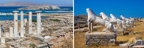 델로스는 태양의 신 아폴로가 태어난 곳으로 유명하다. 신화에 따르면 제우스 때문에 임신을 하게 된 폴로가 헤라를 피해 델로스섬으로 도망쳐 달의 여신 아르테미스와 태양의 신 아폴로를 낳았다. 이후 그리스 전역에서 수많은 순례자가 아폴로의 성지인 델로스섬으로 모여들었다. 기원전 600년에는 12마리의 사자상이 아폴로에게 봉헌되어 아폴로가 태어난 델로스 성호를 향해 세워졌다. 사자상은 수천 년 간 바닷바람을 맞으며 자리를 지키다 1999년에 델로스 박물관으로 이전되었다. 자리에는 복제 사자상이 자리를 지키고 있다.