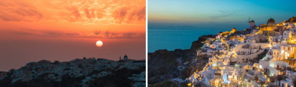 산토리니에는 세계적인 석양 명소가 있다. 섬의 서쪽 마을 이아(Oia)는 세계 3대 석양 명소로 손꼽힌다. 하늘을 빨갛게 물들이는 일몰과 화산 절벽을 빼곡히 채운 흰색 건물들, 그리고 일몰에 반사되어 붉게 빛나는 화산 절벽의 조화가 아름답기로 유명하다. 특히 이아 마을의 서쪽 끝자락에 있는 이아 성(Castle of Oia)은 석양을 보기에 최고의 장소로 알려져 있다. 이아성에는 해적의 침입을 막기 위해 지어진 르네상스 시대의 망루가 아직도 남아있으며, 바다 전망이 발아래로 펼쳐진다. 일몰 몇 시간 전부터 명당을 차지하려는 사람들이 이아 성으로 부지런하게 찾아온다. 일몰 직전에는 발 디딜 틈이 없을 정도로 북적인다. 전 세계에서 온 여행객들이 하나의 석양을 바라보며 감상을 나눈다.