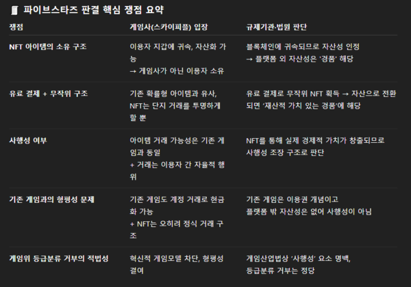 스카이피플은 “기존 게임도 계정 거래로 고가 아이템이 현금화되고 NFT는 오히려 거래 과정을 투명하게 만든다”고 주장했지만 법원은 이를 받아들이지 않았다.