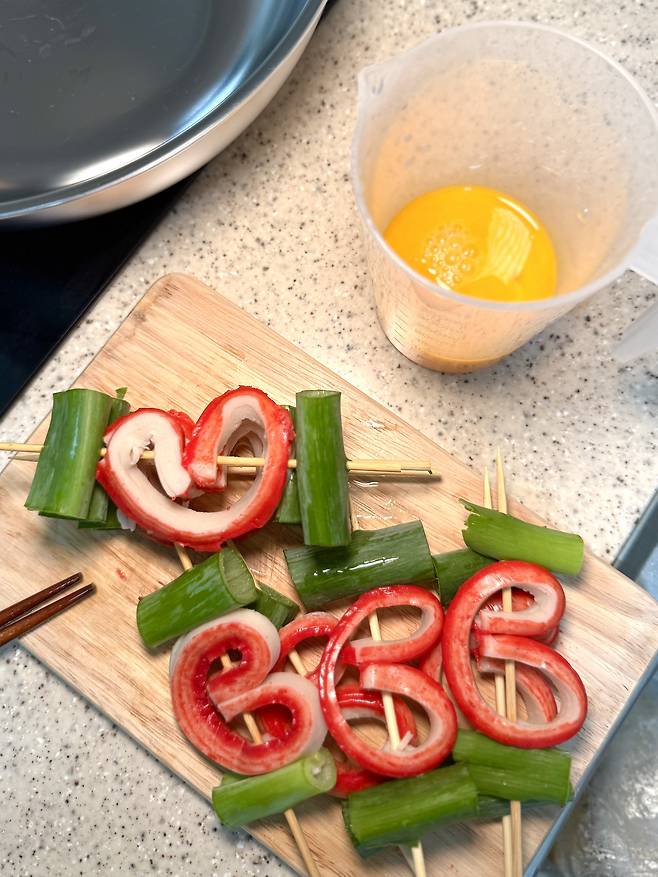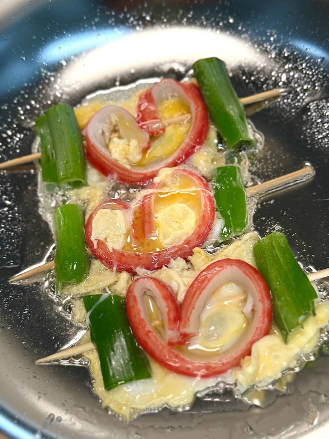🥬 재료 : 김밥용 게맛살, 달걀 2알, 대파 1대, 나무꼬지(혹은 이쑤시개)