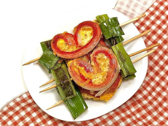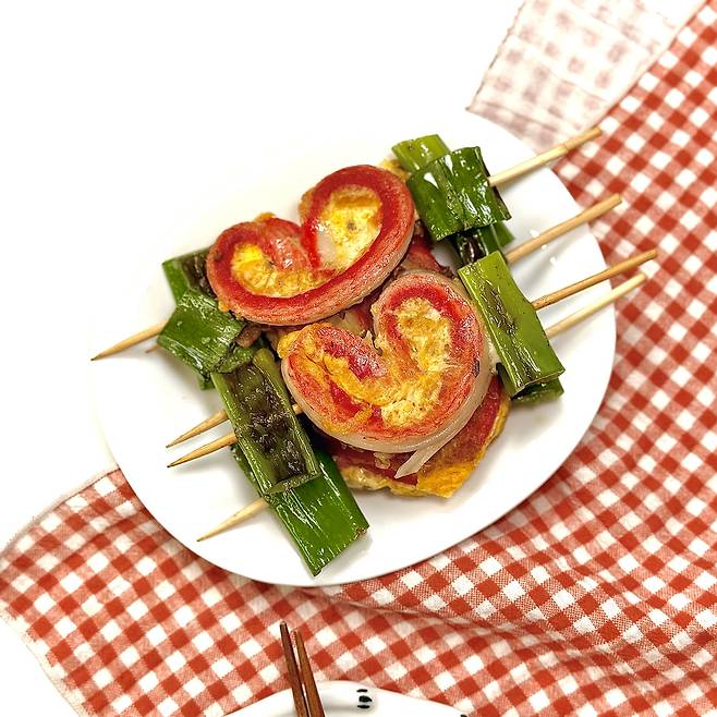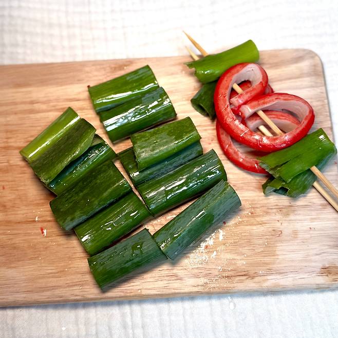 3️⃣ 저는 기다란 꼬지에 꽂아서 남는 부분이 많더라고요. 닭꼬치처럼 대파를 짧게 썰어서 꽂아줬습니다.