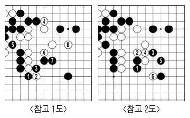 흑89로 시작한 공격이 백을 겁먹게 할 정도는 아니다. 백이 잡힐 수도 있다는 걸 상상하기 어렵다. 흑91이 아닌 <참고 1도> 1로 길을 잡으면 백8로 들어간다. 흑93으로 <참고 2도> 1에 늘면 백6에 붙여 가운데로 나간다.