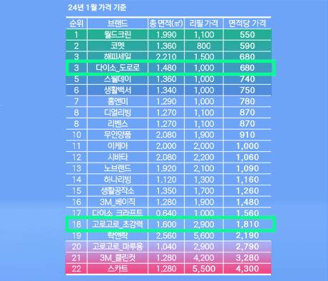 리필 1롤의 가격으로 비교 시 다이소 돌돌이는 폭 16cm 1롤에 1000원꼴이었으며, 고로고로 초강력은 2,900원으로 약 3배 가까이 차이가 났습니다.