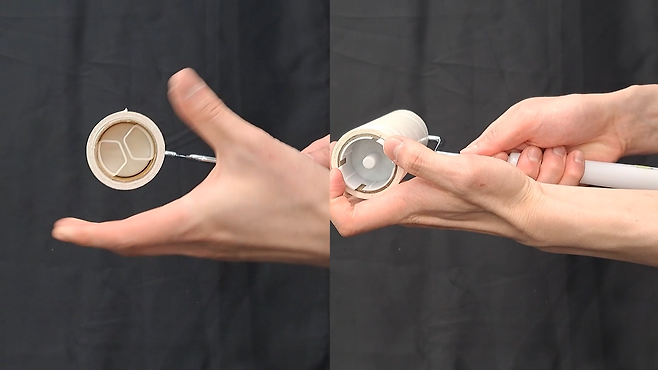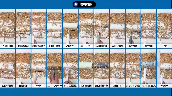 두 제품의 접착력을 비교해 보기 위해 직접 동전, 병아리콩, 짧은 털 위에서 굴려보았습니다.