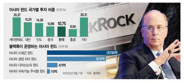 블랙록은 현재 아시아 펀드 4개를 통해 한국 증시에 투자하고 있다. 운용 규모는 약 2조 원이다. 각 펀드에서 한국 주식의 비중은 10~15%로, 한국 투자 규모는 2000억~3000억 원 수준으로 알려졌다.
