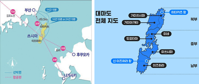 대마도는 대한민국의 영토에서 제일 가까운 일본 땅으로 부산과의 최단거리가 약 49.5km로 날이 좋은 때에는 부산에서 훤히 보일 정도로 가까운 거리에 위치해있습니다. 이러다 보니 쓰시마섬은 한국과 떨어지려야 떨어질 수 없는 관계가 되었습니다.