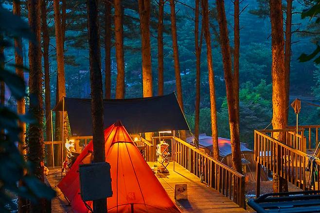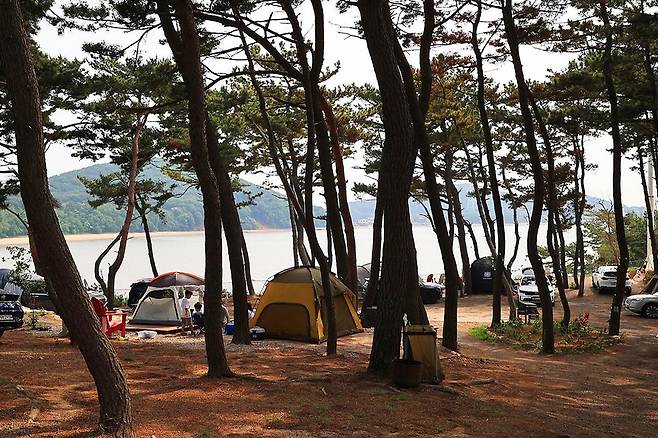 잣나무숲 속 마련되어 있어 맑은 공기 속 캠핑을 즐길 수 있죠. 무성한 소나무 덕분에 그늘이 형성되어 있는데요. 산책 코스와 아이들의 놀이시설, 야외 수영장 등 다양한 즐길 거리가 있습니다. 캠핑장과 함께 글램핑장, 펜션도 있어 편하게 머무를 수 있죠. 캠핑 사이트는 선착순 지정제로 운영되고 있습니다.