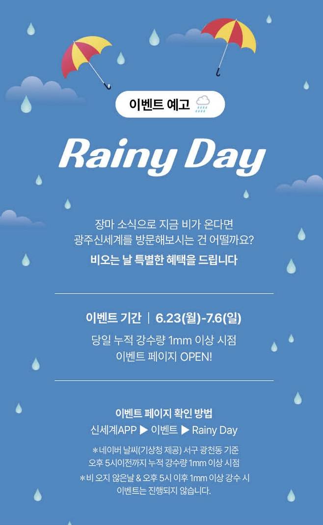 연합뉴스 보도에 따르면 광주신세계는 비 오는 당일 할인과 무료 음료 쿠폰을 제공하는 '레이니 데이(Rainy Day)' 이벤트를 한다고 23일 밝혔다.