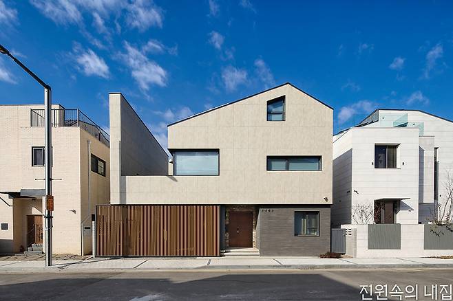 외부마감재 : 외벽 – 삼영석재 세라믹타일 + 두라스택 벽돌(퓨어그레이) + 파주석 / 지붕 –리얼징크