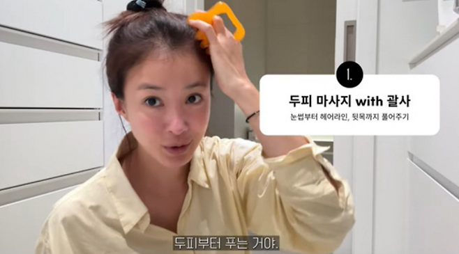 이시영은 두피를 괄사로 풀어주는 것만으로도 리프팅 효과를 느낄 수 있다고 강조했습니다.