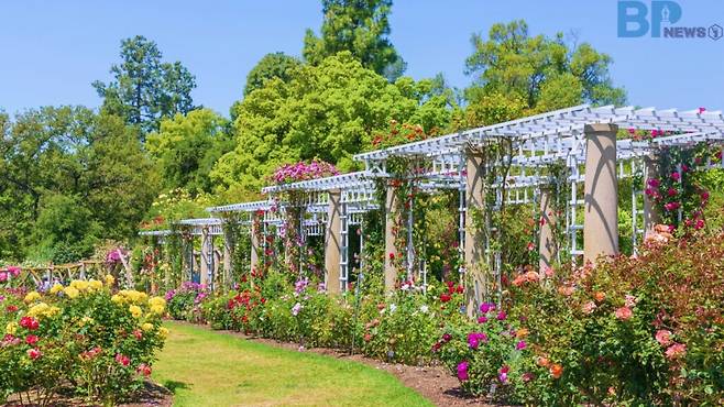 특히 터널처럼 이어지는 구조물에 피어난 덩굴장미는 꽃잎보다는 흐르는 곡선의 실루엣과 그 아래의 빛이 더 오래 남는다.