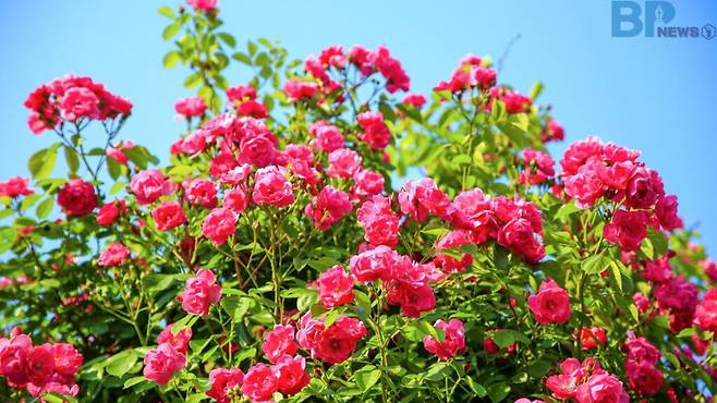 강바람이 불어오는 자전거길 옆으로 기다란 덩굴장미 터널이 서서히 색을 입기 시작하면서다.