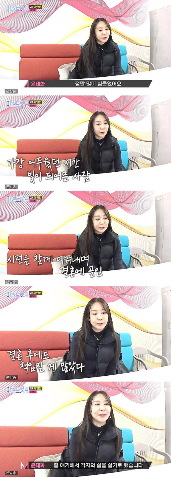 윤태화는 전남편에 대해 “한때 사랑했던 진심에 후회는 없다. 저는 겪어봐야 아는 아둔한 성격이라 철없어 보일 수도 있단 생각이 든다. 각자의 부모님을 더 잘 모시고 서로의 삶을 응원하고 있다. 제 인연에 미안하고 고마울 뿐이다”라고 마음을 전했습니다.