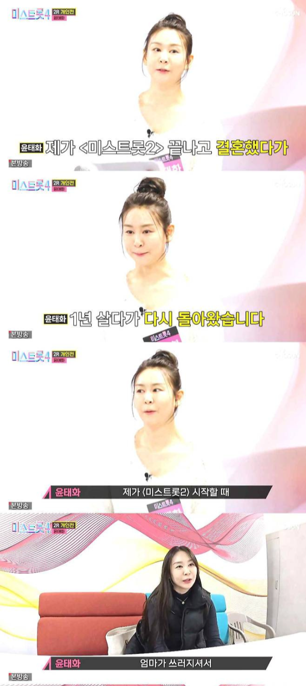 윤태화는 이어 "'미스트롯2' 시작할 때 어머니께서 쓰러지셔서 많이 힘들었다. 당시 남자친구와 결혼했지만, 제가 가장인 건 변함이 없었다. 어머니를 돌봐야 했기에 아내로서의 역할을 충분히 하지 못했고, 서로 잘 이야기하며 각자의 삶을 살기로 했다"며 "마음에 와닿아 이 노래를 선택하게 됐다"고 설명했습니다.