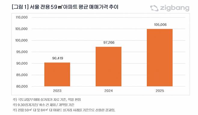 부동산 플랫폼 직방에 따르면, 올해 9월 말 기준 서울 전용 59㎡ 아파트 평균 매매가격은 10억5006만원으로 집계됐다.