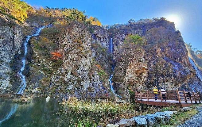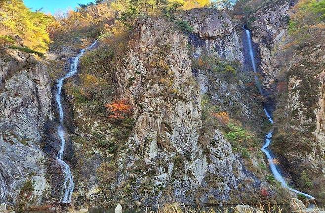 바위 틈을 타고 두 줄기로 떨어지는 3단 폭포 구조 덕분에 시원한 물줄기와 공간의 깊이가 동시에 느껴지며, 겨울철에는 차갑게 가라앉은 계곡 공기와 어우러져 더욱 장엄한 분위기를 만든다.