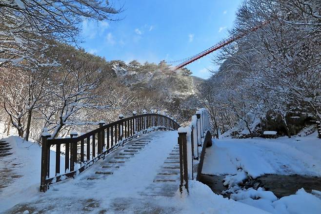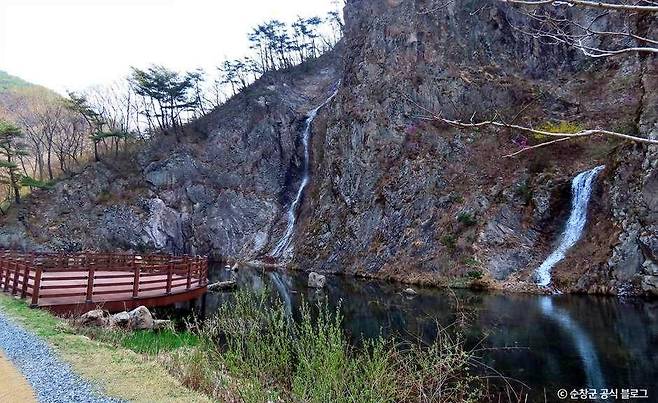 입구에서 폭포까지 이어지는 1.2km 산책로는 데크길과 흙길이 적절히 섞여 있어 남녀노소 부담 없이 걸을 수 있다. 동선 중에는 병풍폭포, 강천사, 그리고 구름다리까지 볼 수 있어 지루할 틈이 없다.