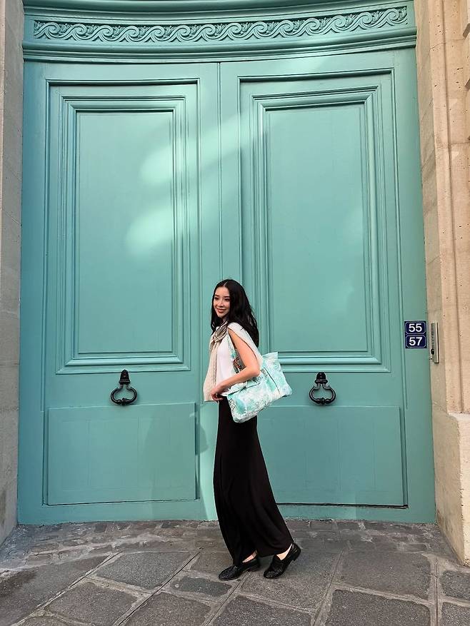 내추럴한 생머리와 미소는 도시적이면서도 여유로운 분위기를 더하며, 화장을 거의 하지 않은 듯한 클린한 메이크업도 이번 룩의 완성도를 높였다. 배경인 파리의 명소 에펠탑과 어우러져 로맨틱한 도시 감성이 강조됐고, 코디 자체가 여행 패션으로도 손색없는 구성을 보여줬다.
