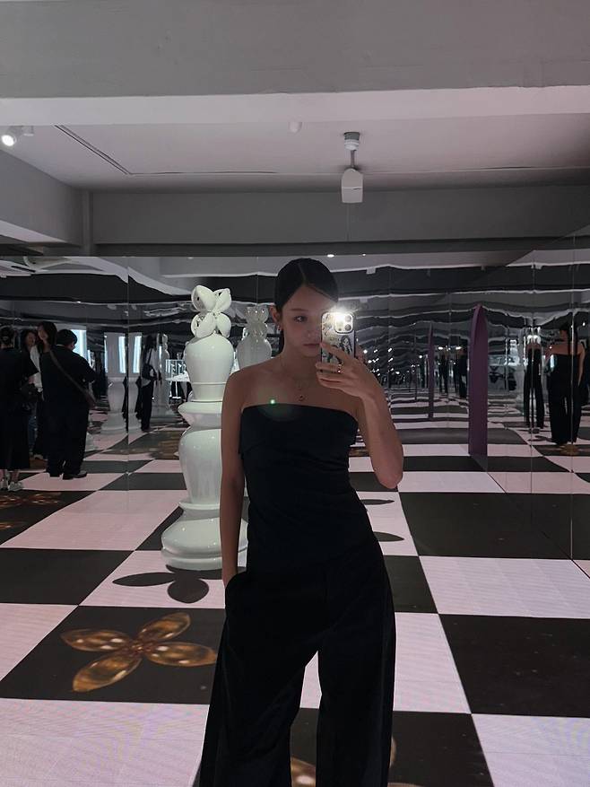 혜리는 거대한 체스말 오브제와 거울이 어우러진 공간에서 올블랙 튜브톱 점프수트를 선택해 세련된 분위기를 연출하고 있다. 어깨와 쇄골 라인이 드러나는 디자인으로 우아함을 강조했으며, 미니멀한 액세서리와 자연스러운 포즈가 도시적인 감각을 더한다. 전체적으로 절제된 스타일링이 공간의 예술적 무드와 조화를 이루며, 현대적인 시크함을 극대화한다.