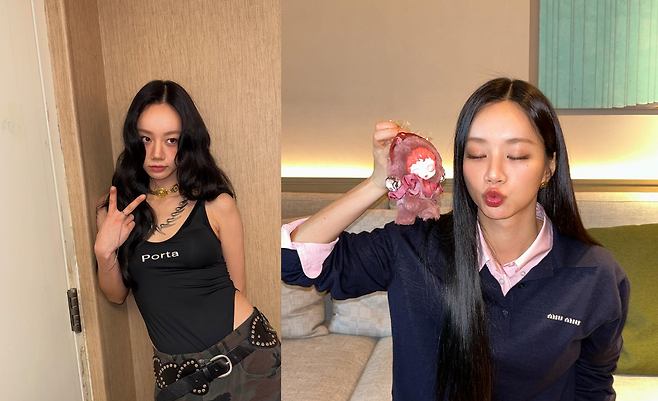 두 번째 사진에서 혜리는 블랙 슬리브리스 톱과 카모플라주 패턴의 팬츠를 매치해 자유분방한 스트리트 감성을 드러내고 있다. 볼드한 체인 목걸이와 스터드 벨트가 포인트 역할을 하며, 손가락으로 브이 포즈를 취해 개성 넘치는 분위기를 완성한다. 전체적으로 트렌디하면서도 편안한 스타일링이 돋보인다.