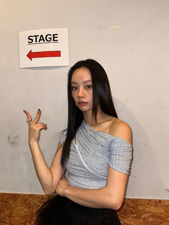 마지막 사진에서 혜리는 은은한 광택의 오프숄더 톱과 블랙 스커트를 매치해 무대 뒤 대기실에서의 긴장감과 설렘을 표현하고 있다. 비대칭 어깨 라인과 드레이핑 디테일이 세련된 실루엣을 완성하며, 심플한 액세서리와 자연스러운 포즈가 무대 위 아티스트의 프로페셔널함을 부각시킨다.