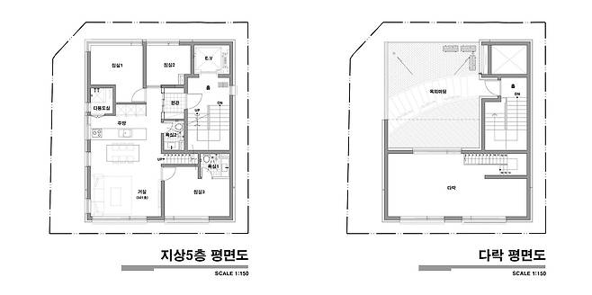매우 작은 대지이지만 작은공간에서 더 넓게 공간을 사용할 수 있는 것에 포커스를 두었기에 확장형 발코니를 최대로 설계했고 가족이 사는 거실은 주방과 거실을 하나의 오픈형태로 설계하여 시각적으로 넓고 개방된 느낌을 주는 공간의 확장성을 느껴지도록 하였다. 그리고 아이들이 밝게 뛰어노는 모습과 온가족이 담소를 나누는 것을 상상해 보았다. 머릿속에 그려진 상상은 가족만을 위한 힐링 공간 설계로 이어졌고 그 결과물은 5층의 주택공간이 다락으로 연결되고 다락앞에서는 옥외마당으로 연계되게 하여 상가주택이지만 단독주택에서 느낄 수 있는 풍경과 여유를 제공하여 도심속에서 자연과 교감할 수 있는 공간을 마련하였다.