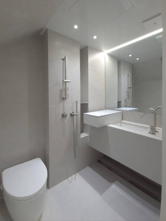 사실 부지가 워낙 작아서 1층에 법적 주차대수를 만족하는 주차공간에 상점까지 넣기에는 충분하지 않은 상황이었다. 배치 대안을 다양하게 정말 많이 검토하였고 그 결과 조건을 만족시키는 가장 효율적인 배치를 하게 되었다. 작은 땅에서 최대의 면적 확보가 관건 이었기에 확장형 발코니설계로 실내 공간을 최대로 넓게 사용할 수 있도록 했고 숨은 공간을 활용하여 작은 대지의 한계를 극복하고자 했다. 그 결과 연면적은 94평이지만 실사용면적은 161평으로 최대치로 설계하는데 성공하였다. 이렇게 해서 각각의 영역을 존중하면서 함께 공존하는 상가주택이 완성되었다.
