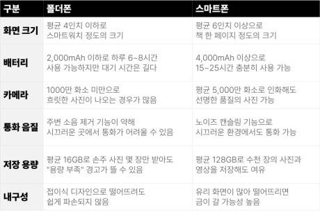 "충전하는 것을 자주 잊어버린다"는 어르신에게 유리합니다. 폴더폰은 대기 시간이 길어 몇 일간 충전하지 않아도 긴급 통화는 가능한 경우가 많습니다.