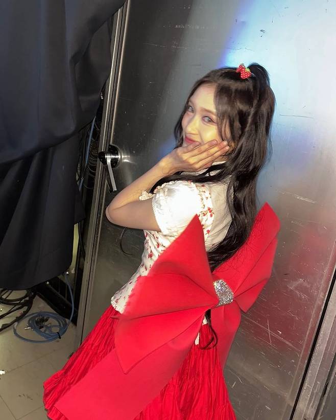 이서의 스타일링은 상의부터 강렬하다. 가슴선을 드러낸 튜브톱 형태의 화이트 크롭톱은 바디 실루엣을 강조하면서도 깔끔한 인상을 준다. 하의는 레드 체크 패턴의 플리츠 미니스커트로, 하이틴 스쿨룩에서 착안한 듯한 느낌을 전한다. 허리에는 버클 장식과 흰색 스트랩이 더해져 시선을 집중시키며, 전체적인 룩의 중심을 잡아준다.