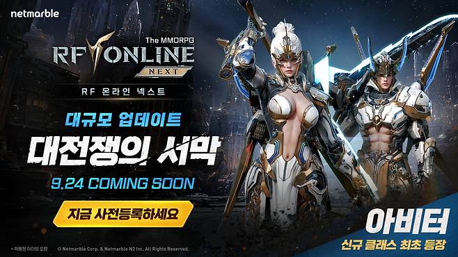 넷마블(대표 김병규)은 MMORPG ‘RF 온라인 넥스트(RF ONLINE NEXT, PC/모바일)’가 신규 바이오슈트 ‘아비터’ 업데이트를 앞두고 24일까지 사전등록을 실시한다고 10일 밝혔다.