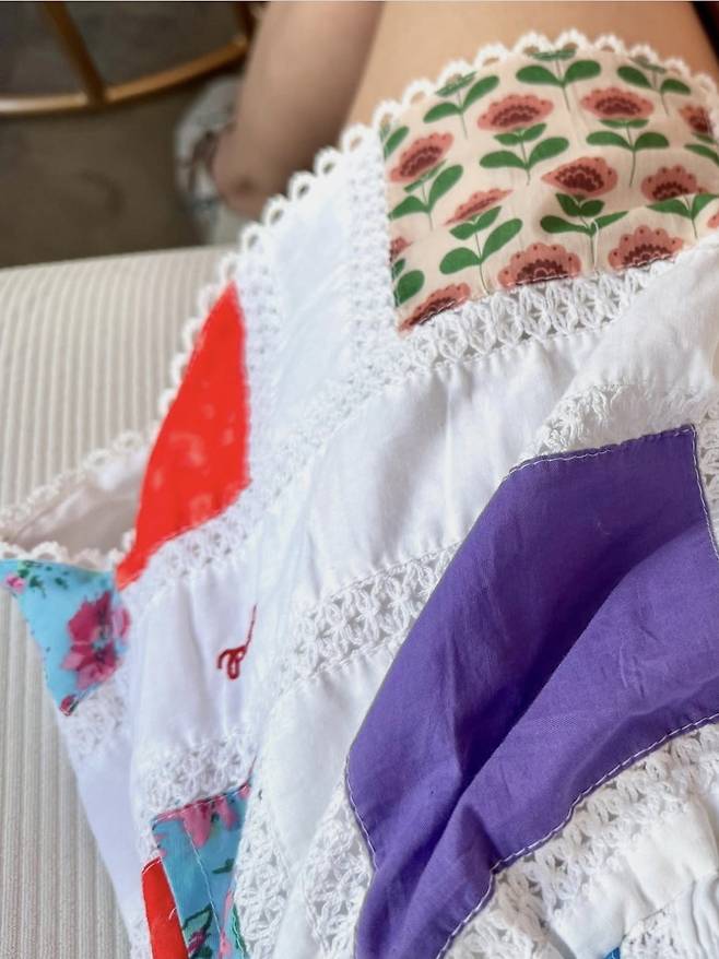 컬러풀한 패턴이 콜라주처럼 조합된 반바지는 전체적인 룩에 생기를 불어넣었으며, 레이스 디테일로 포인트를 더해 감각적인 무드를 연출했습니다.