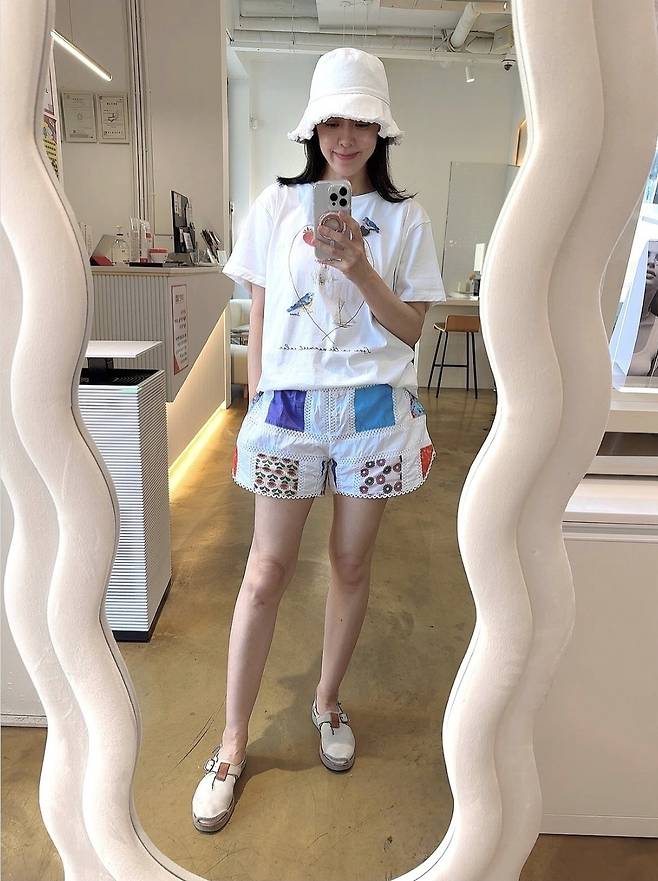 강성연은 화이트 버킷햇에 프린팅 티셔츠, 그리고 눈에 띄는 패치워크 반바지를 매치해 편안하면서도 독보적인 스타일링을 선보였습니다.