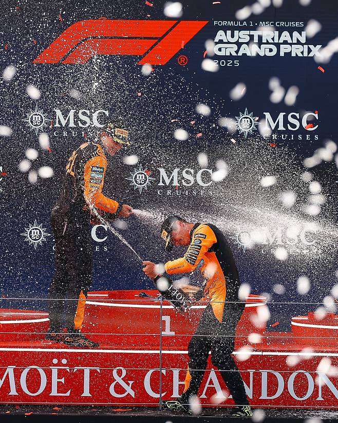 맥라렌은 29일 오스트리아의 레드불 서킷에서 노리스가 팀동료 피아스트리와 한지붕 접전을 벌인 끝에 2.695초 차이로 먼저 체커기를 받았다. 지난 5월 모나코GP 이후 시즌 3승째.