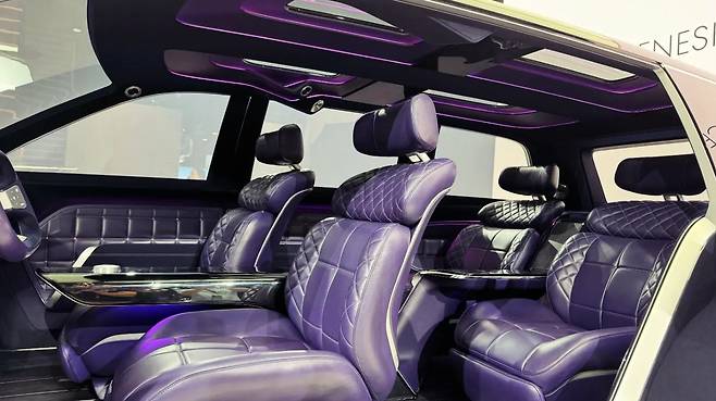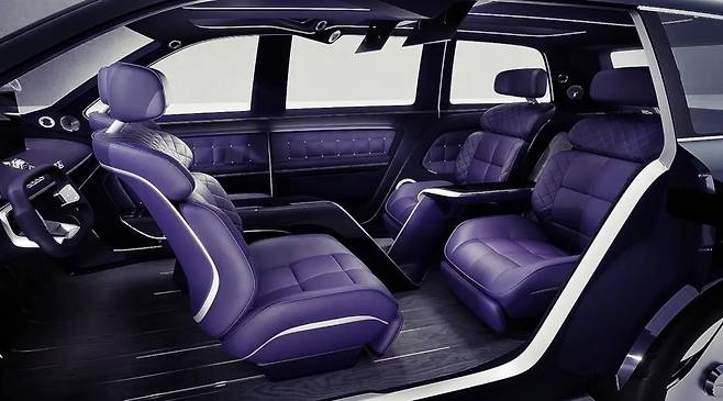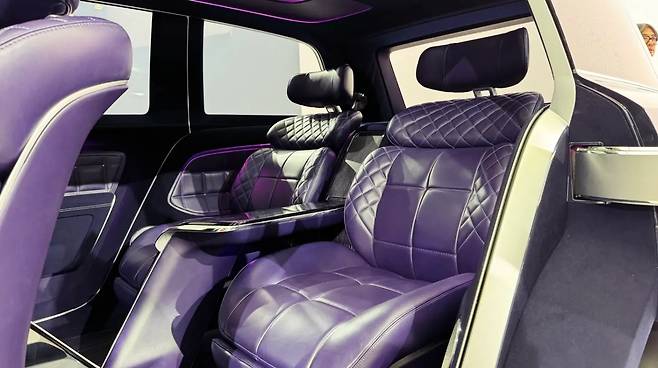 가장 먼저 시선을 사로잡는 것은 바로 인테리어의 색상과 디테일이다. 실내에는 퍼플 계열의 고급스러운 트림이 적용되어 있으며, 도어 패널에는 콘셉트카에서 선보였던 사각형 무늬가 그대로 녹아들었다. 시트 역시 4개의 독립 구조로 구성되어 있으며, 2열에는 캡틴 체어 방식의 좌석과 버터플라이 스타일 헤드레스트가 장착돼 고급스러움을 더한다.