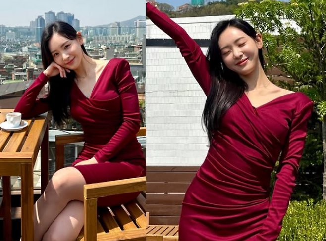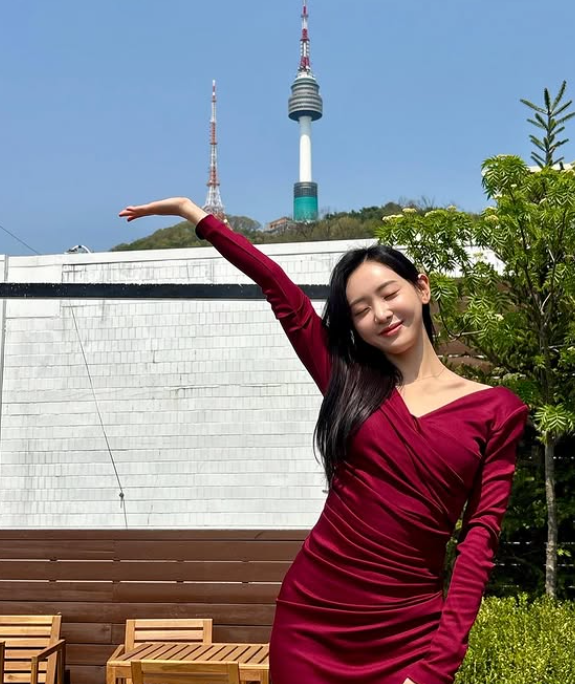 김다영의 스타일은 고혹적인 매력을 발산하는 모습이었습니다. 그녀는 진한 빨간색 미니 원피스를 입고 깊은 브이넥라인과 주름이 진 슬림한 핏으로 여성미를 강조했습니다. 주얼리 없이도 레드 원피스 하나만으로 완벽한 미모를 자랑하며, 그 자체로 고급스러운 스타일을 완성했습니다.