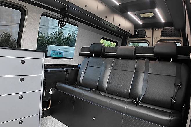 실내 구성은 기존 서밋 밴스의 고급스러운 감각을 일부 덜어내고, 더 실용적인 방향으로 정제됐다. 운전석과 거주 공간 사이를 나누는 벽 없이 오픈 레이아웃으로 설계됐으며, 전체 인테리어는 그레이 톤 바닥과 벽, 천장, 캐비닛으로 통일감을 준다. 주방 공간은 130리터 부시맨 냉장고, 커버가 있는 싱크대, 여섯 개의 서랍과 상부 수납장으로 구성되어 있으며, 거주성과 수납성을 모두 고려한 설계가 돋보인다.