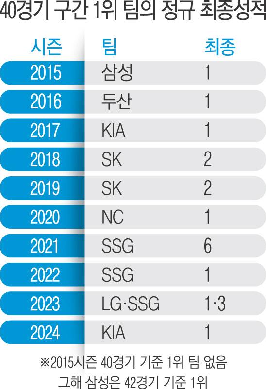 2015년에는 초반 혼전 속에 40번째 경기를 치르고 1위를 기록한 팀이 없었다. 그해 정규시즌 우승팀 삼성은 42경기째 1위에 올랐는데 2015년 삼성을 포함해 2016년 두산, 2017년 KIA, 2020년 NC, 2022년 SSG, 2023년 LG, 2024년 KIA까지 7차례나 40경기째 1위 팀이 정규시즌을 1위로 마치는 이력을 남겼다.