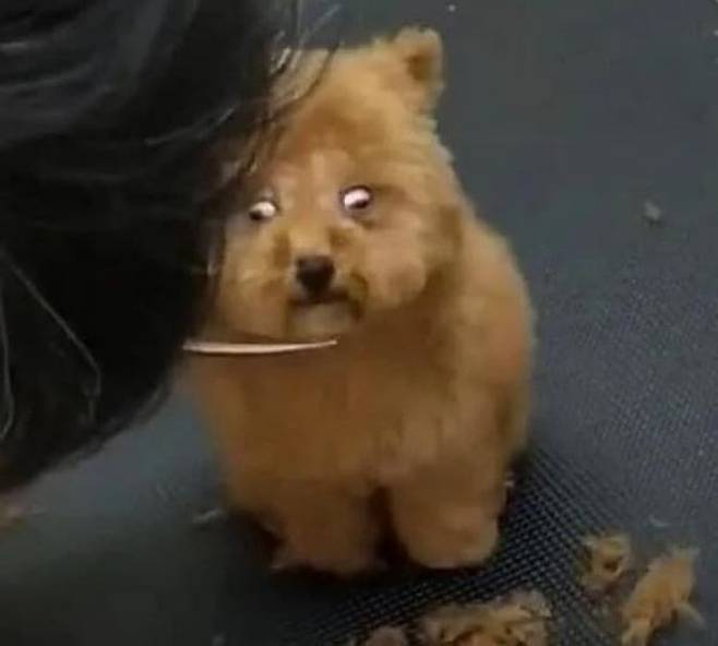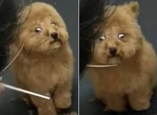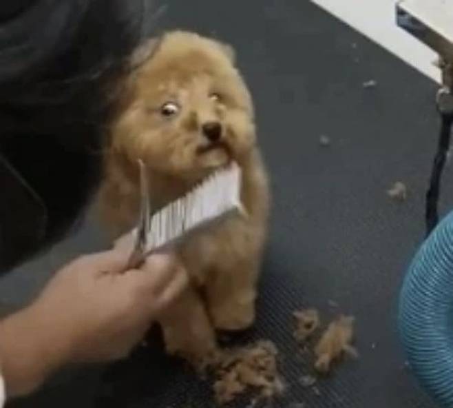 얼마나 많이 놀랐는지 동공이 확장된 상태로 미용을 받았는데요. 잔뜩 겁에 질려서 미용을 받고 있는 강아지 모습 매우 인상적입니다.