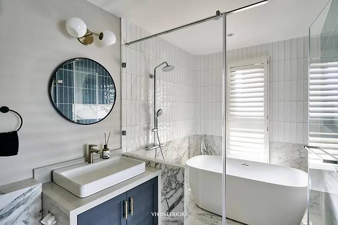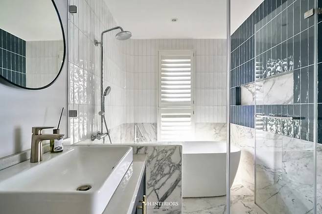 욕실은 단순한 기능적 공간을 넘어 휴식 공간에 가깝습니다. 중앙의 독립형 욕조가 공간의 중심을 잡고, 유광 타일과 아치형 타일이 빛에 따라 다양한 분위기를 연출합니다.
