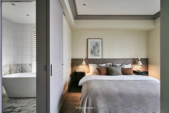 헤드보드까지 이어지는 홈 패턴과 간접 조명이 은은한 분위기를 조성하고, 크림톤 컬러가 안정감을 더합니다. 대칭 구조가 클래식하면서도 깔끔한 인상을 줍니다.