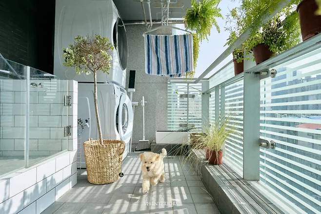 작업용 발코니는 단순한 보조 공간이 아니라 하나의 생활 공간으로 확장되었습니다. 세탁기와 건조기뿐 아니라 반려동물을 위한 욕조까지 배치되어 실용성을 높였습니다. 햇빛이 잘 들어 밝고 쾌적하며, 자주 사용하는 공간으로 완전히 바뀐 모습입니다.